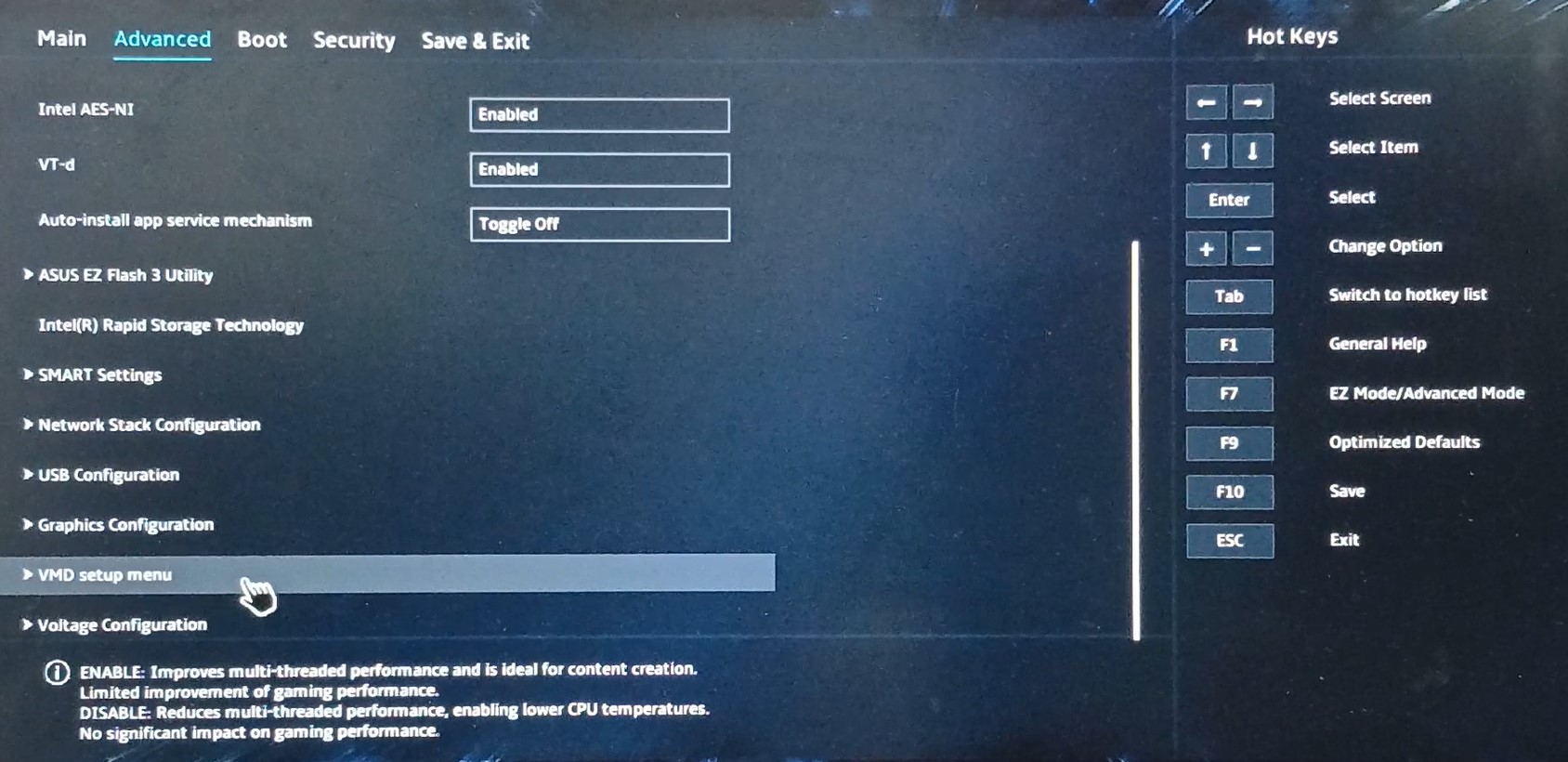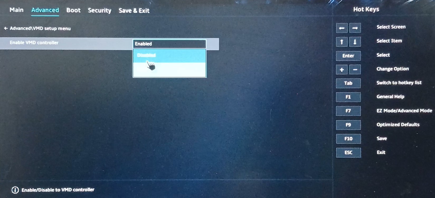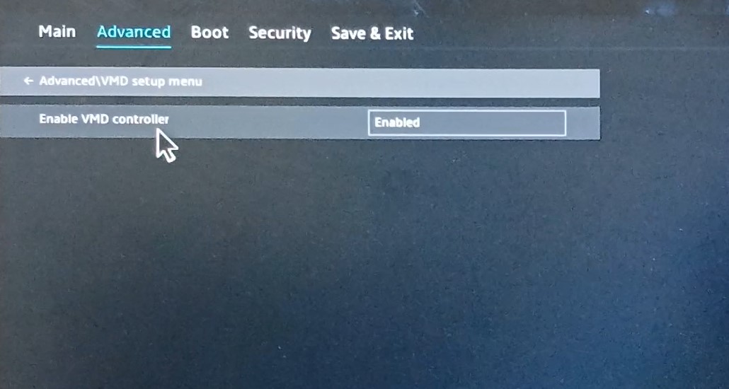 'Advanced' tab 아래 'VMD setup menu'로 가서 'VMD controller' 항목을 'Disabled'로 변경합니다.