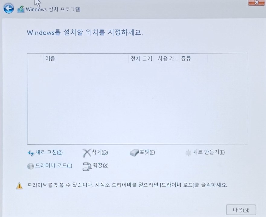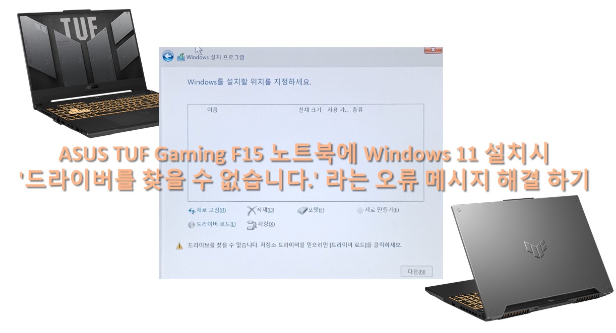 이번 내용은 ASUS TUF Gaming F15 노트북에 Windows 11 설치시 '드라이버를 찾을 수 없습니다.' 라는 오류 메시지가 떠