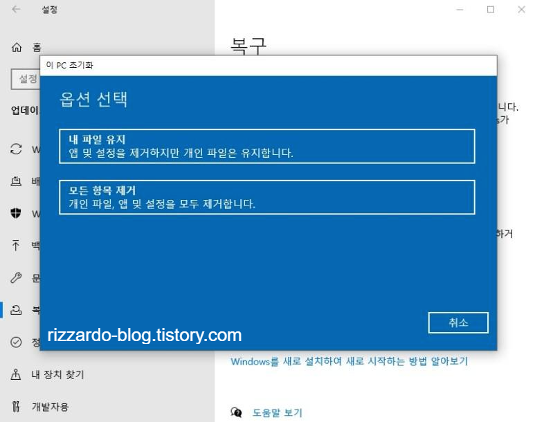 1909 빌더에서는 PC 초기화 항목내 별도의 선택 방법이 없었으나