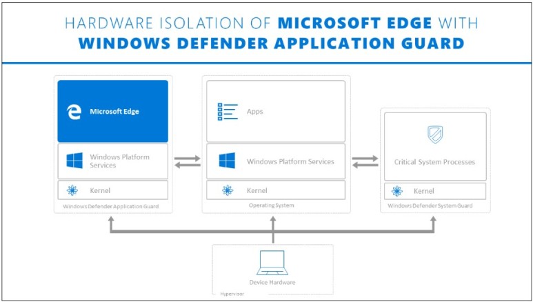 직원이 Microsoft Edge 또는 Internet Explorer를 통해 신뢰할 수 없는 사이트로 이동하면 Microsoft Edge는 호스트 운영 체제와 별도로 운영되는 격리된 Hyper-V 기반 컨테이너에서 사이트를 연다. 이러한 컨테이너 격리 덕분에 신뢰할 수 없는 사이트가 악성으로 판명되면 호스트 PC가 보호되고 공격자는 엔터프라이즈 데이터에 접근할 수 없다. 예를 들어 이 방법을 사용하면 격리된 컨테이너가 익명이 되기 때문에 공격자가 직원의 엔터프라이즈 자격 증명을 얻을 수 없다.