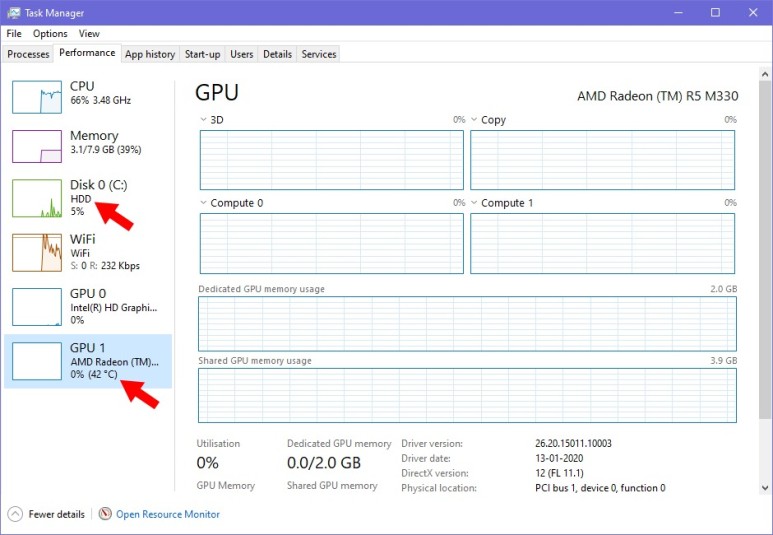 전용 GPU 카드가 있는 경우 장치의 작업 관리자에 GPU 온도(현재 섭씨에서만 사용 가능)를 추가하여 성능 탭에서 확인할 수 있다.