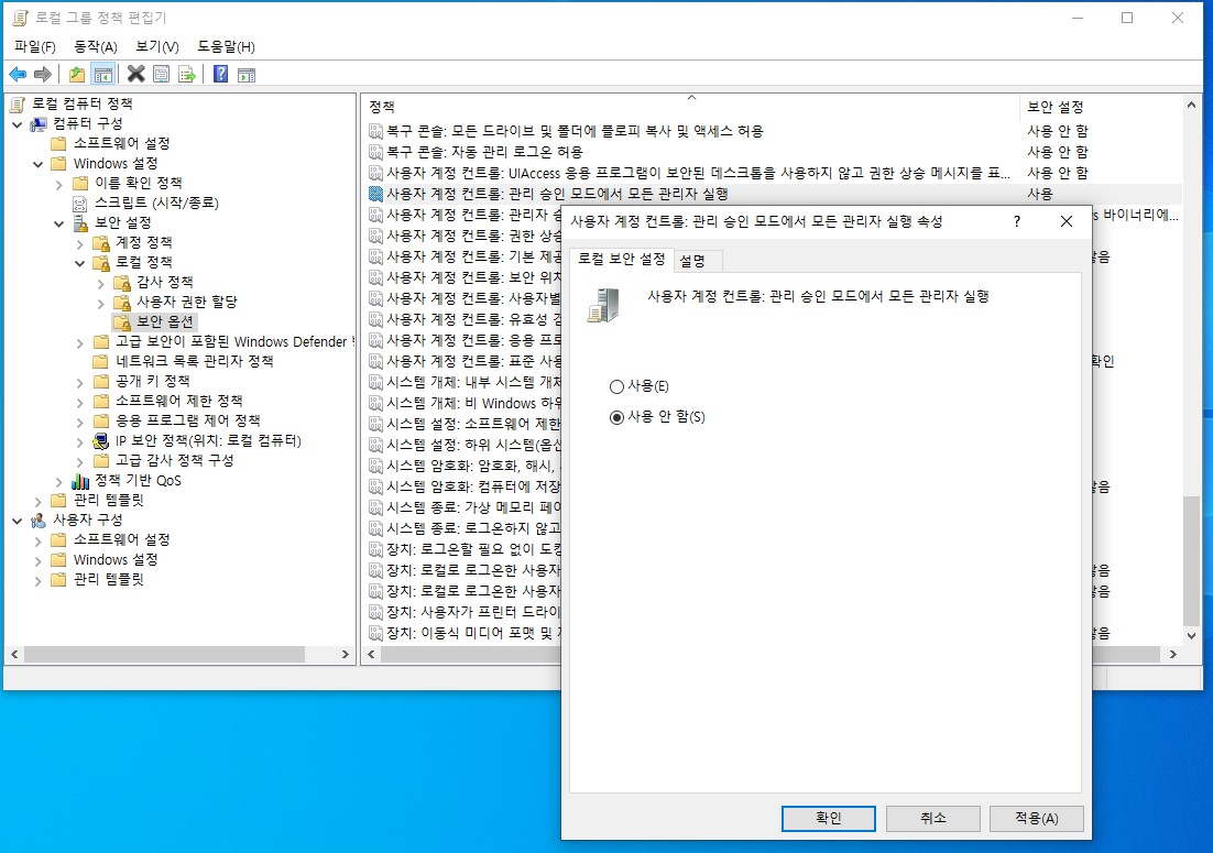 오른쪽 정책 항목에서 '사용자 계정 컨트롤:관리 승인 모드에서 모든 관리자 실행' 을 '사용' 에서 '사용 안 함' 으로 변경 후 다시 시작을 하면 특정 프로그램이 실행되지 않는 문제를 해결할 수 있습니다.