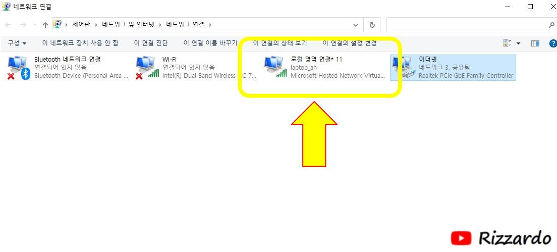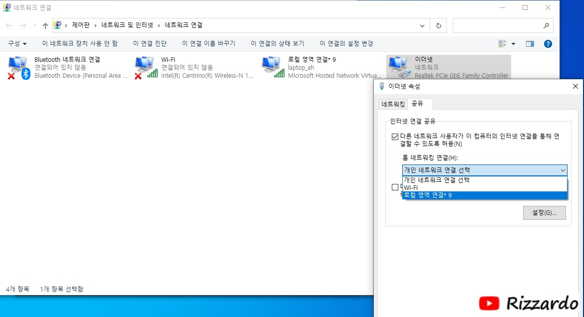 3.노트북에 연결된 유선랜을 공유합니다.