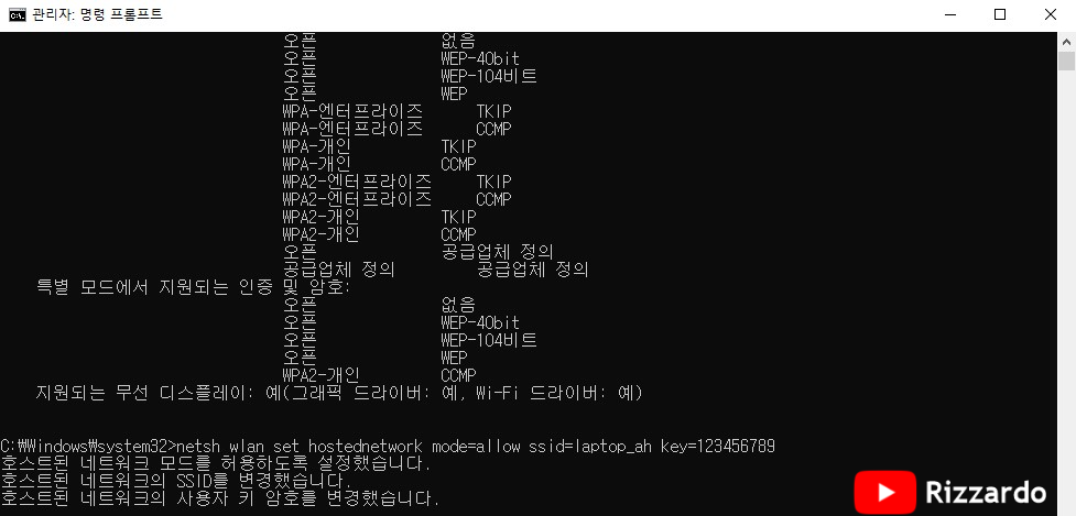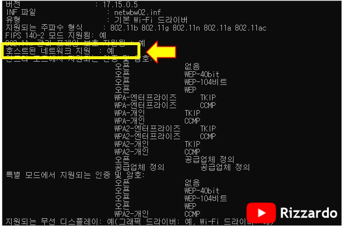 다음 명령을 입력하여 "호스트된 네트워크 지원 : 예" 로 표시되면 AD-HOC 기능을 사용할 수 있습니다.