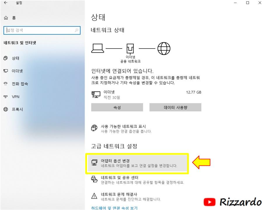 '고급 네트워크 설정'에서 '어댑터 옵션 변경'을 클릭합니다.