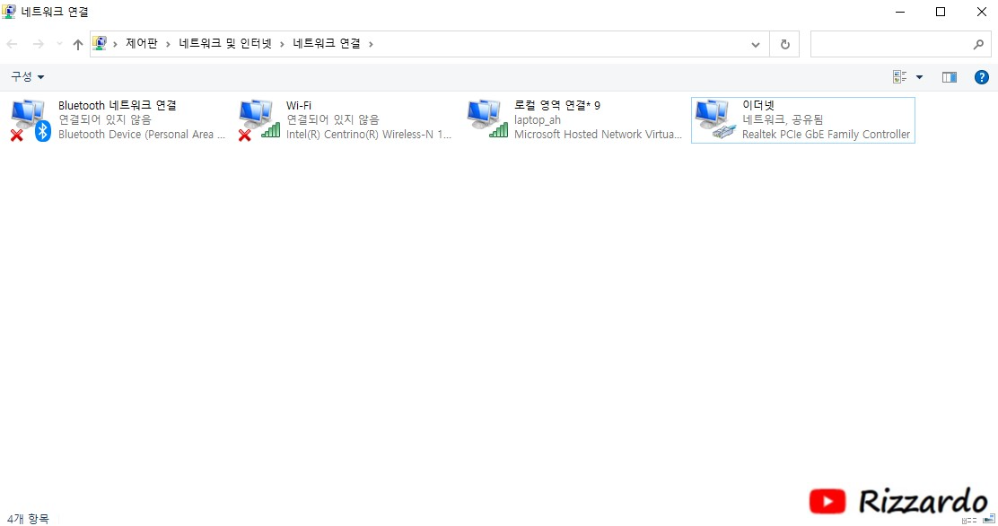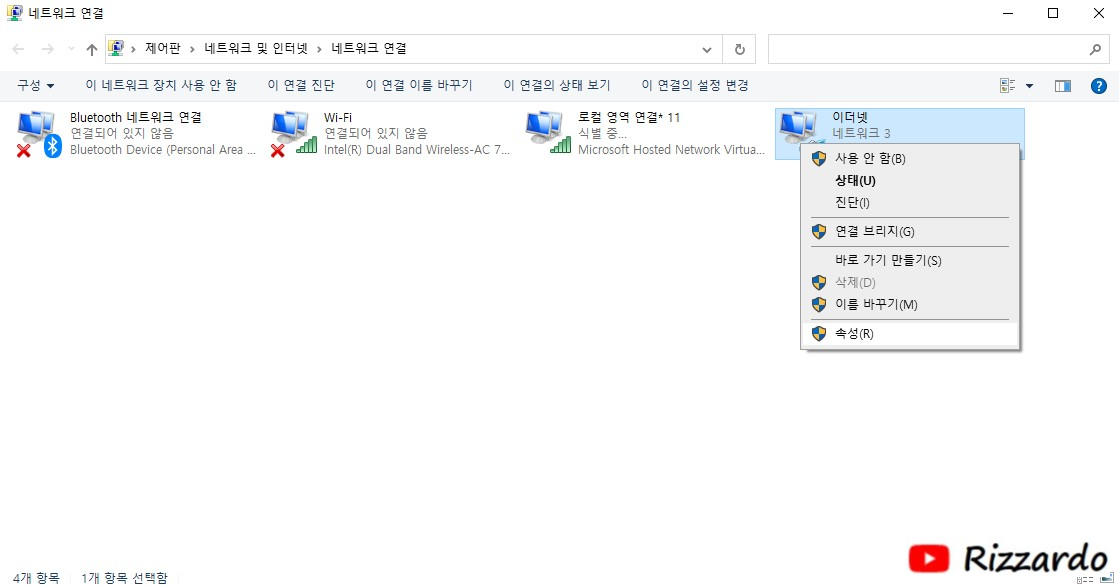 이제 노트북에 연결된 유선 네트워크를 공유하려면 '이더넷'을 마우스 오른쪽 버튼으로 클릭한 후 다음 '속성'을 실행합니다.