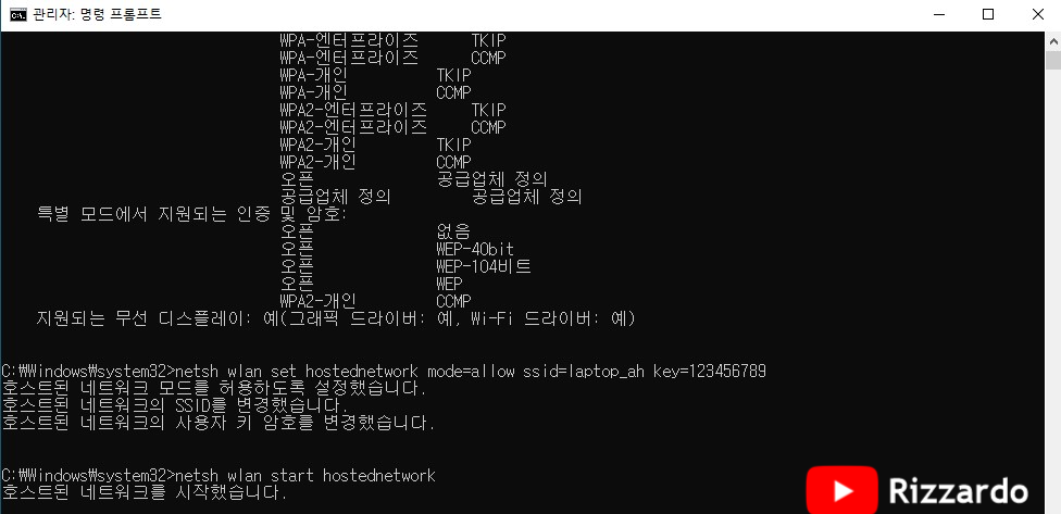 '호스트된 네트워크를 시작했습니다.'라는 메시지가 표시되면 가상 AP가 활성화된 것입니다.