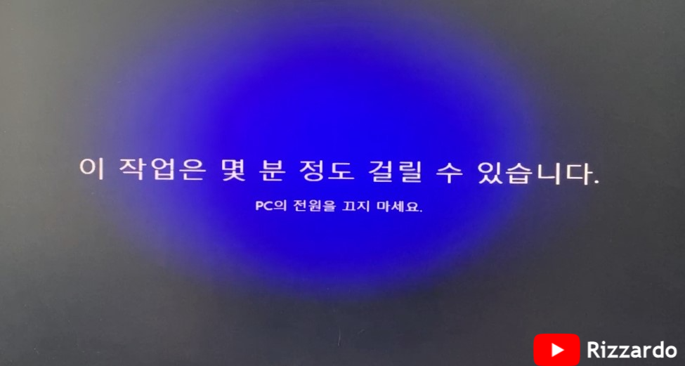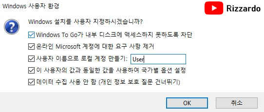 Rufus 프로그램 설정 후 옵션 선택 항목 중 "Windows 사용자 환경"을 필자와 같이 했다면 (구형 PC의) TPM/Memory/CPU 등 시스템 요구사항을 무시하고 다음가 같은 화면으로 바로 넘어갈 것입니다.