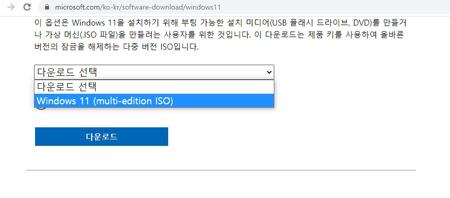 우선 마이크로소프트사의 다운로드 홈페이지에서 Windows 11 운영체제의 ISO 파일을 내려 받습니다.